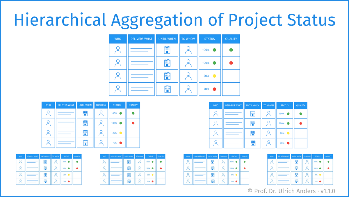 Considering projects in this way offers a lot of transparency. It is immediately clear, how information is aggregated up. The ratios at the top result directly from the underlying information. The status for each aggregated deliverable is just the aggregated status of its underlying sub-deliverables.