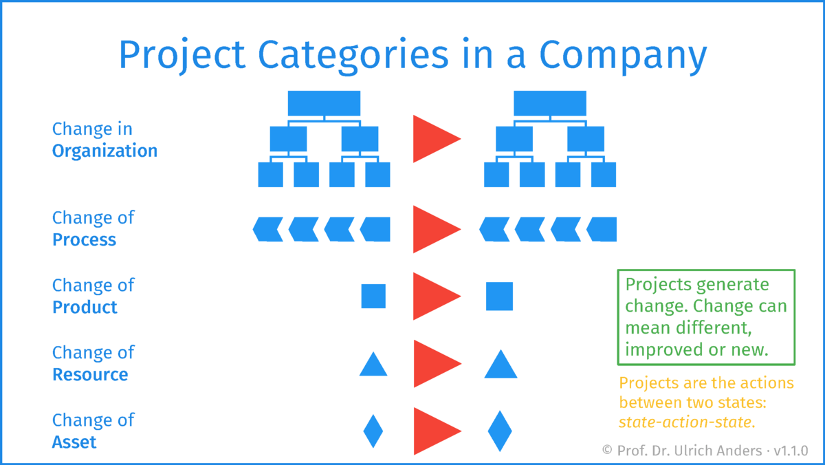 In one word, projects are change. Projects change an existing situation into a new situation. In the technical world this is called State-Action-State and this concept is widely applied. The concept of State-Action-State is also useful to understand the categories of projects in a company.