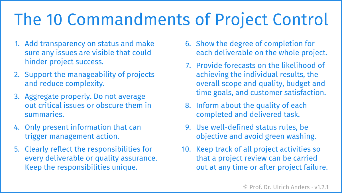 In order to add to the discussion, this article suggests 10 criteria, that are important for project status reporting. These criteria will in the further course be called the 10 Commandments of Project Control. They have been battle tested in projects over time, but research on them is still going on.